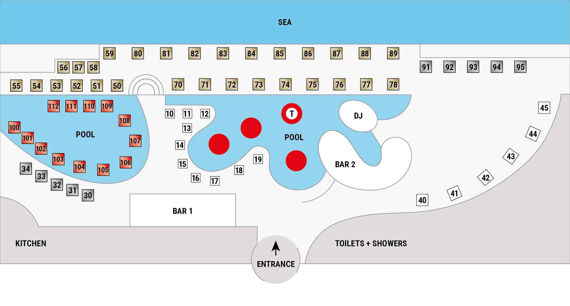 Pálmafák szegélyezik a kör alakú pihenőket és luxus napágyakat, míg a DJ-pult a medence felől diktálja a tempót. Víz alatti hangszórók tartják életben a ritmust még a vízben is. A piros-fehér részletek kiemelkednek a türkiz háttérből, friss, kortárs megjelenést kölcsönözve a terasznak.